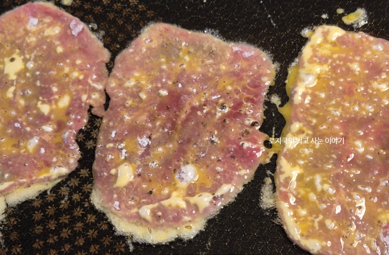 달궈진 팬에 식용유를 두르고 예열한 뒤, 계란옷을 입힌 고기를 올립니다. 중약불에서 앞뒤로 노릇하게 익혀주세요. 너무 오래 굽지 않는 것이 포인트!