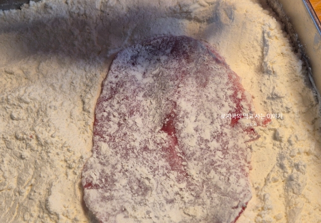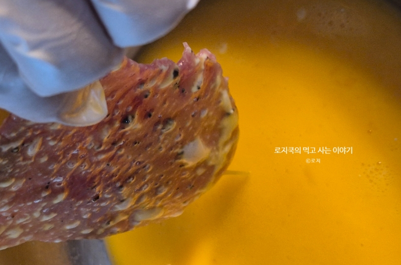 그릇에 계란을 풀어 두고, 고기에는 먼저 부침가루를 얇게 묻혀줍니다. 이렇게 하면 계란물이 잘 달라붙어 고기가 한층 부드럽고 고소해집니다.