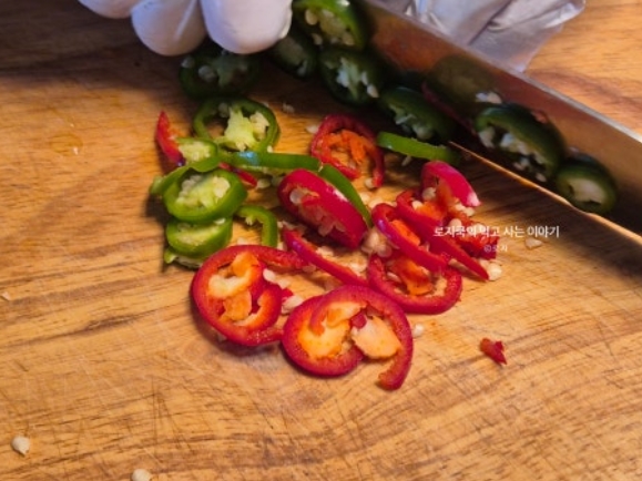 홍두깨살은 오래 구우면 질겨질 수 있으니 겉만 노릇하게 색이 나면 불을 줄이는 것이 좋습니다. 모양을 내기 위해 홍고추와 청양고추를 얇게 썰어서 올려 구워주셔도 좋습니다.