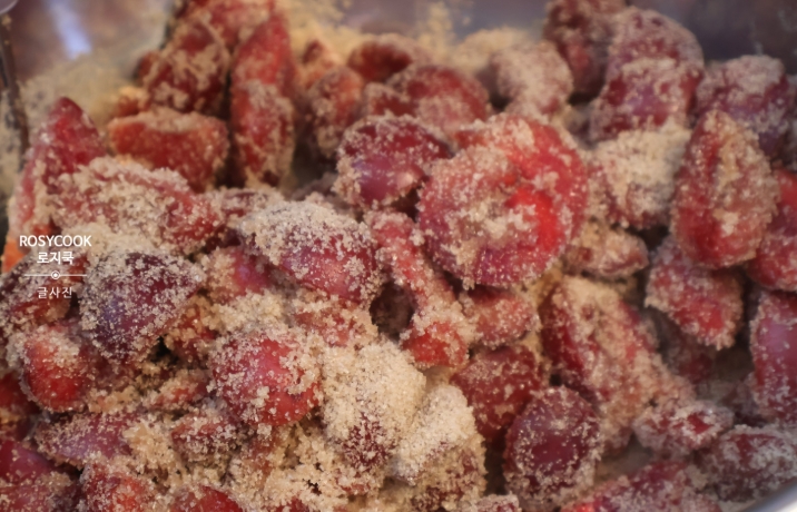 손질한 피자두 1kg에 설탕 1kg을 넣고 골고루 버무려 주세요.
