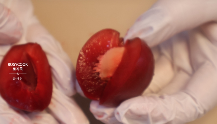 꼭지를 제거하고 4등분하여 씨를 제거합니다. 깨끗이 손질된 자두는 설탕과 잘 섞이기 때문에 더욱 깔끔한 청이 완성돼요.