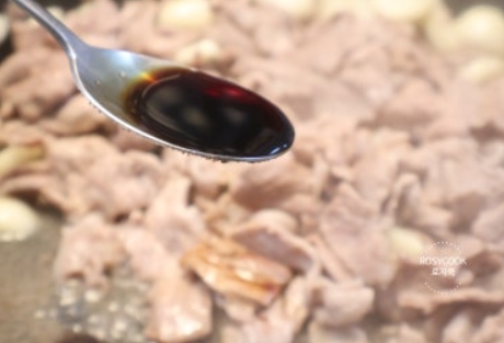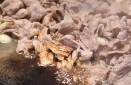 9. 달달 볶다가 고기를 잠시 밀어둔 후, 진간장을 넣고 끓여줍니다.