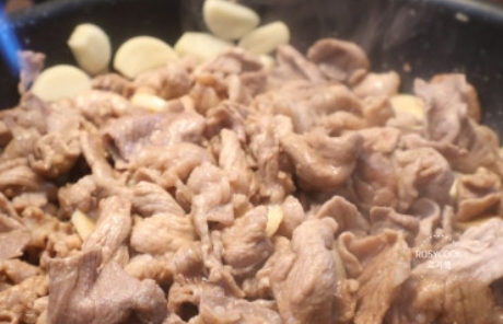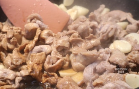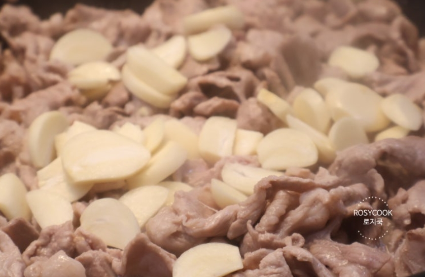 6. 고기가 어느정도 익었따면 마늘을 넣고 함께 볶아줍니다. 노릇해질 때까지 진행합니다.