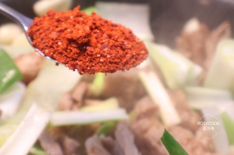 12. 고춧가루를 넣어줍니다. 기존 레시피는 고운 고춧가루와 굵은 고춧가루를 반반씩 섞어서 넣는 것입니다.