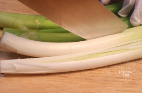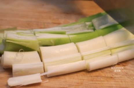 1. 대파를 길게 반으로 갈라준 후, 큼직큼직하게 썰어줍니다.
