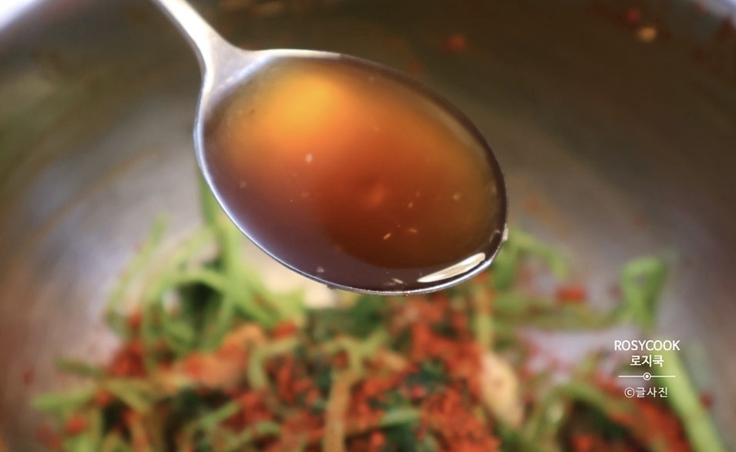 8. 양조간장 1 큰 술과 들기름 1 큰 술을 넣어주고 조물조물 무쳐줍니다.