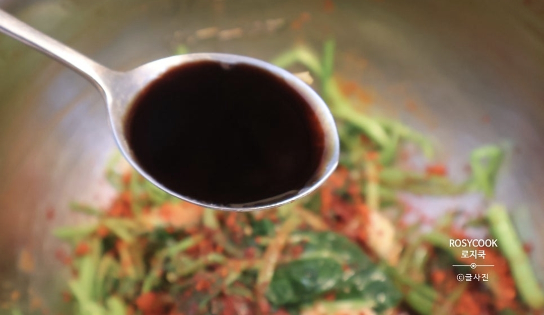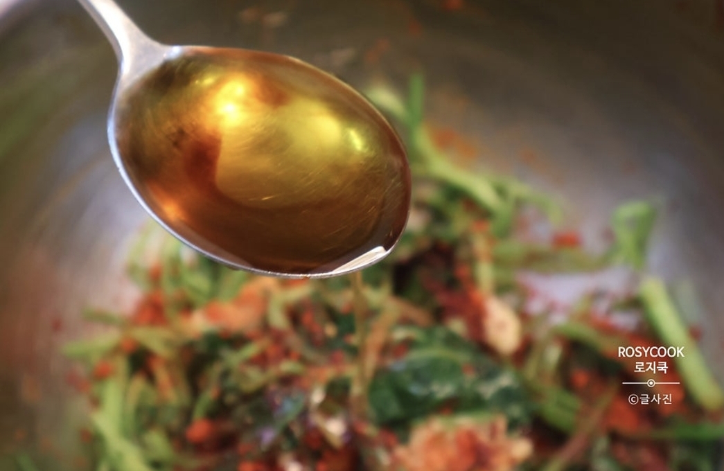 8. 양조간장 1 큰 술과 들기름 1 큰 술을 넣어주고 조물조물 무쳐줍니다.