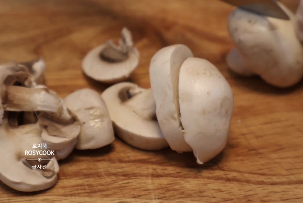 먼저 마늘은 얇게 편 썰고, 양송이버섯은 도톰하게 썰어줍니다.