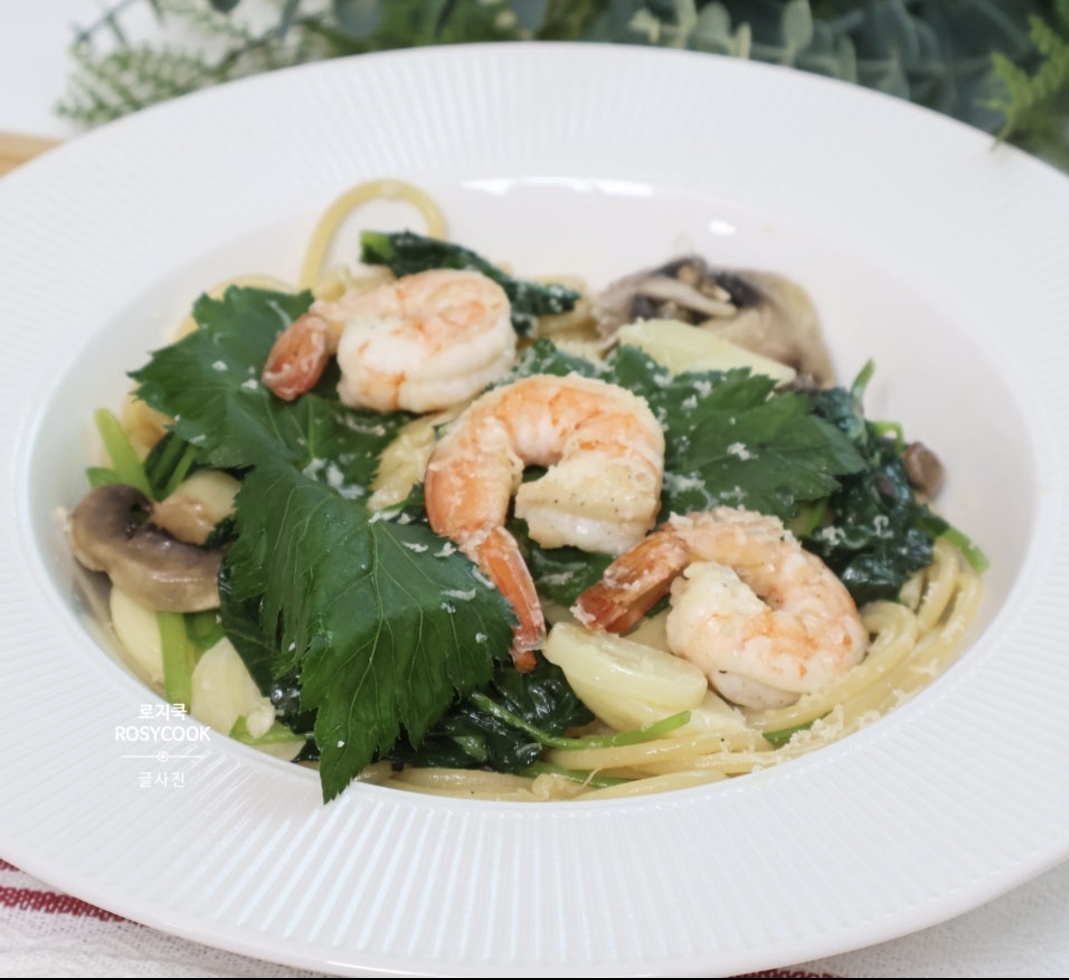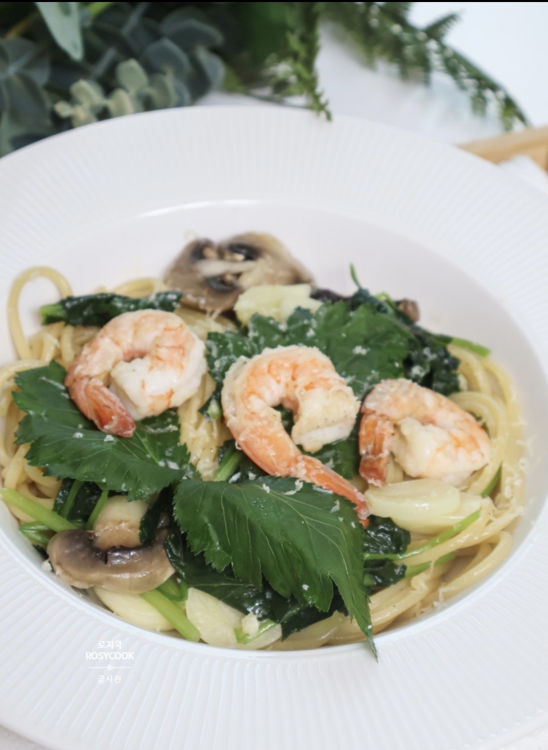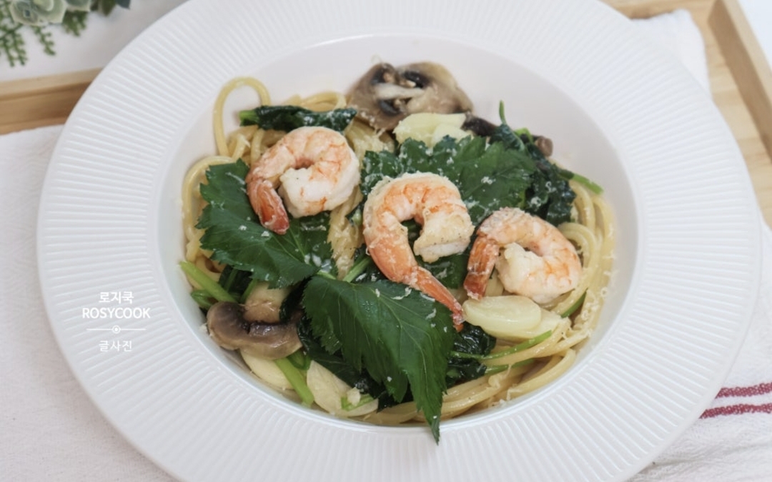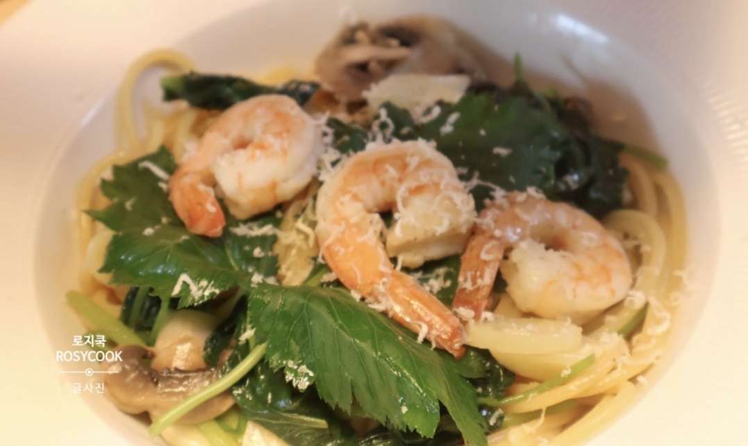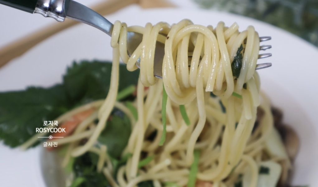 오늘은 향긋한 참나물과 고소한 들기름을 활용해, 특별한 새우 오일파스타 들기름 파스타 만들어 봤어요.