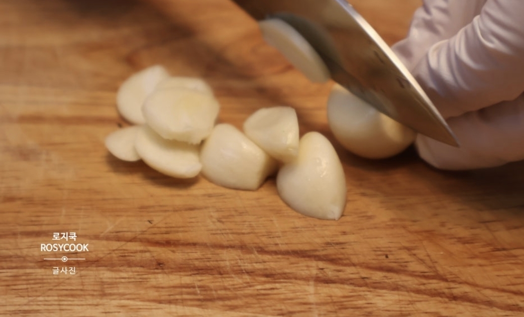 먼저 마늘은 얇게 편 썰고, 양송이버섯은 도톰하게 썰어줍니다.