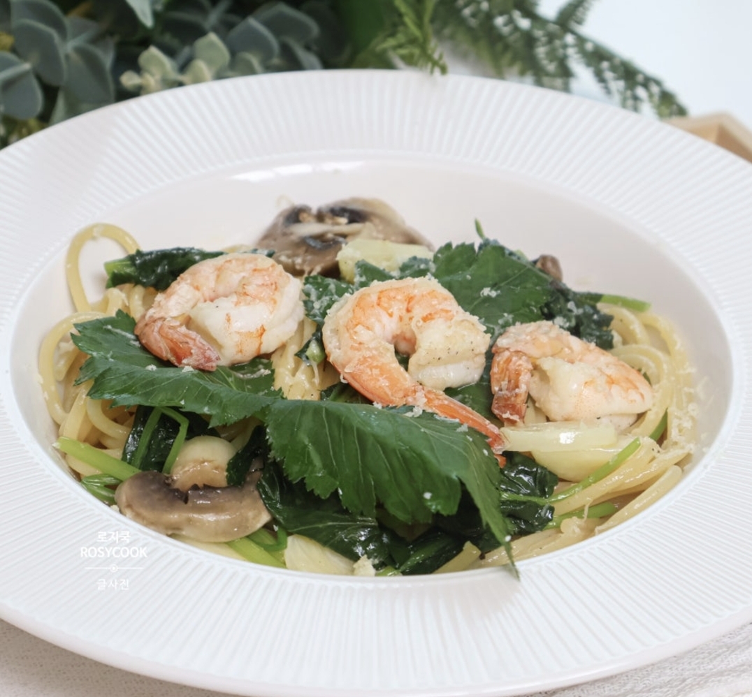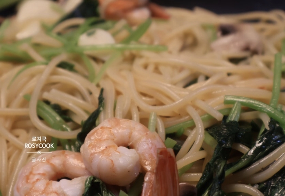 참나물의 은은한 향과 들기름의 고소함, 그리고 탱글한 새우 식감까지 더해져 정말 완성도 높은 새우 오일파스타가 들기름 파스타가 되었답니다.