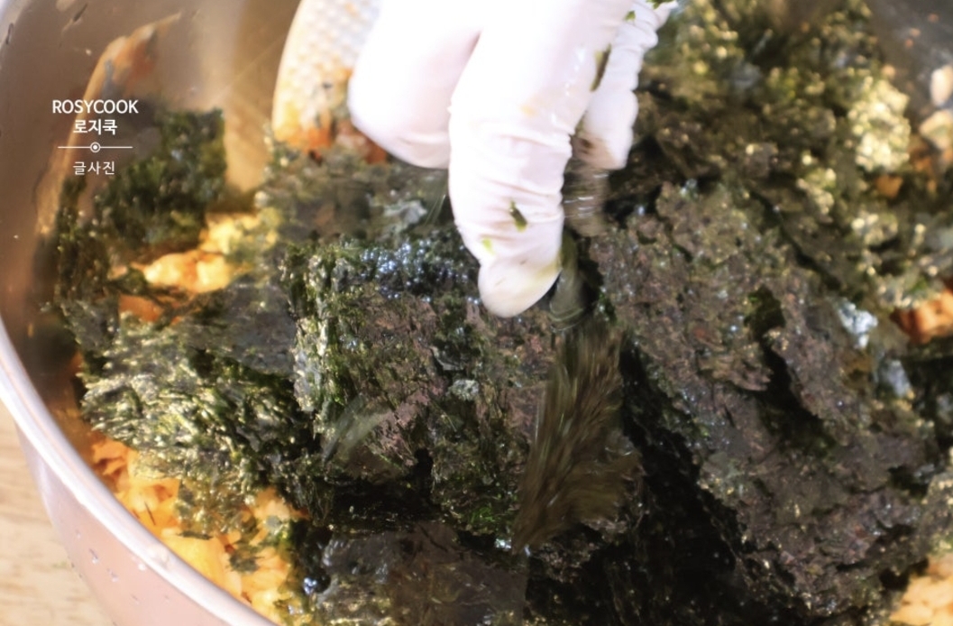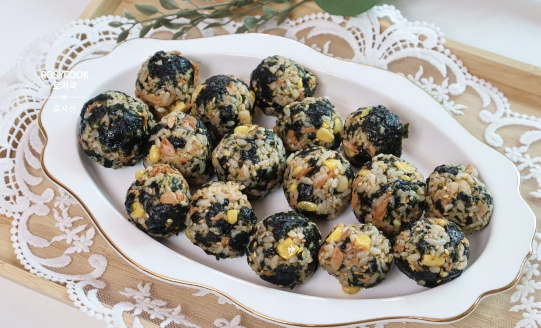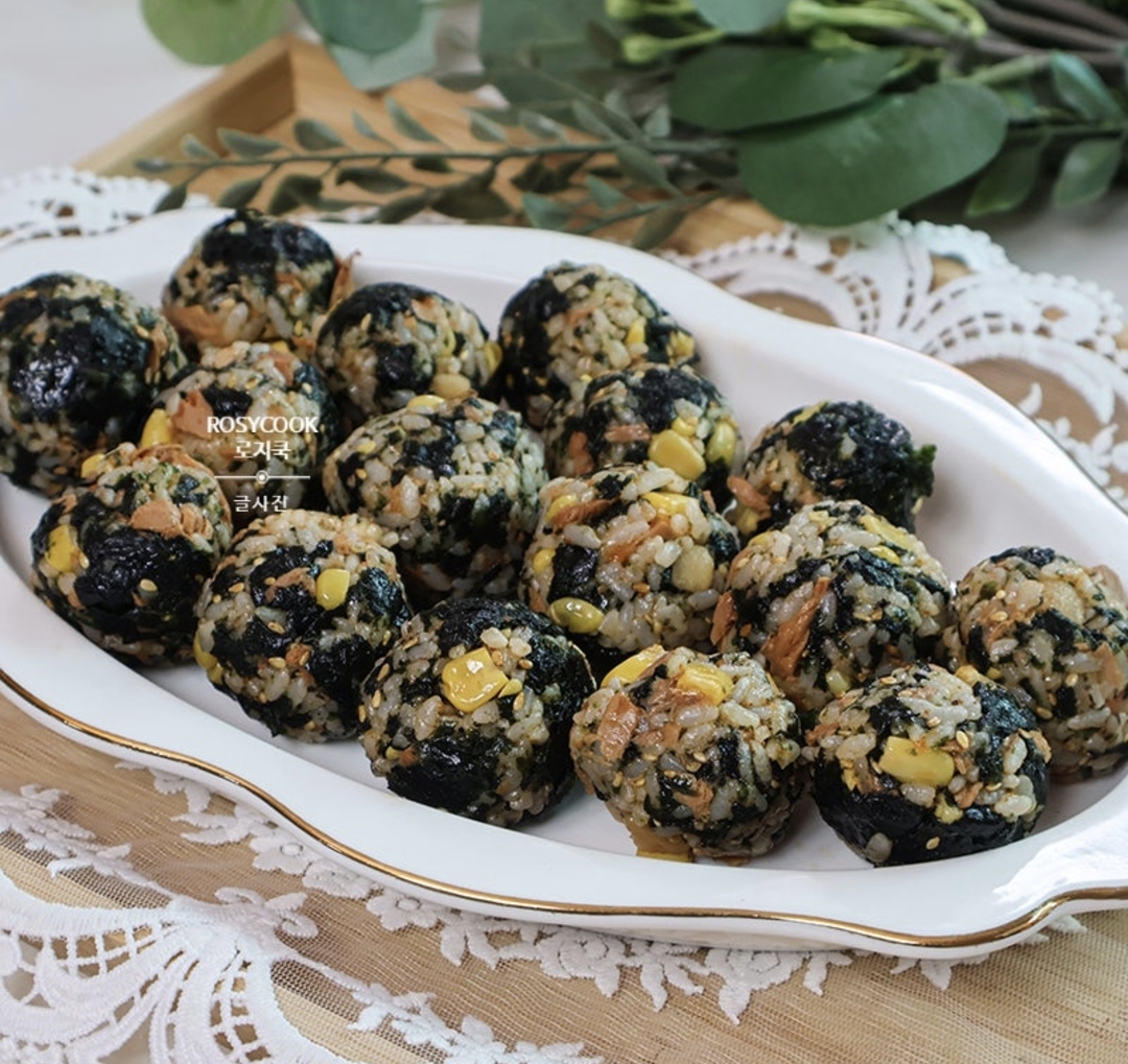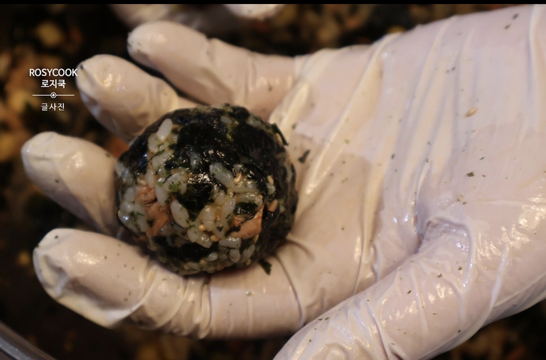 6. 밥을 먹기 좋은 크기로 뭉친 후, 동그랗게 굴려줍니다.