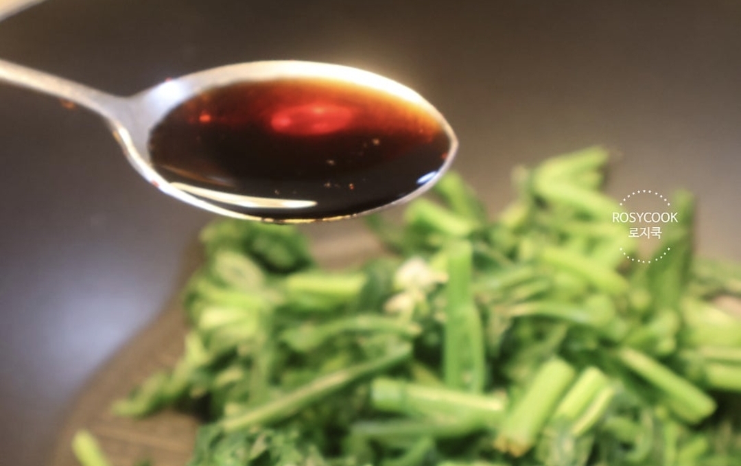 4. 팬에 손질해둔 취나물에 국간장 2 큰 술을 넣어줍니다.