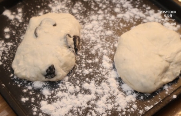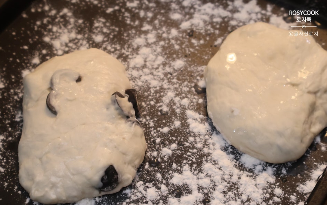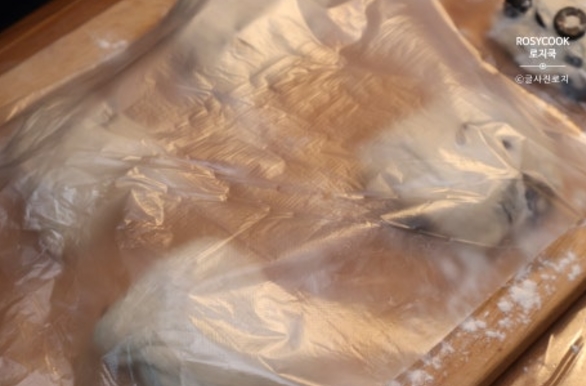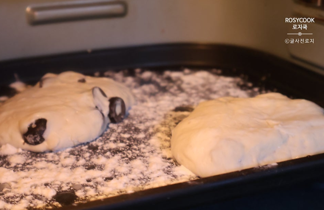 18. 덧가루를 뿌려서 에어프라이어 오븐 팬에 올려준 후, 비닐로 덮어서 45분 발효해 줍니다.
