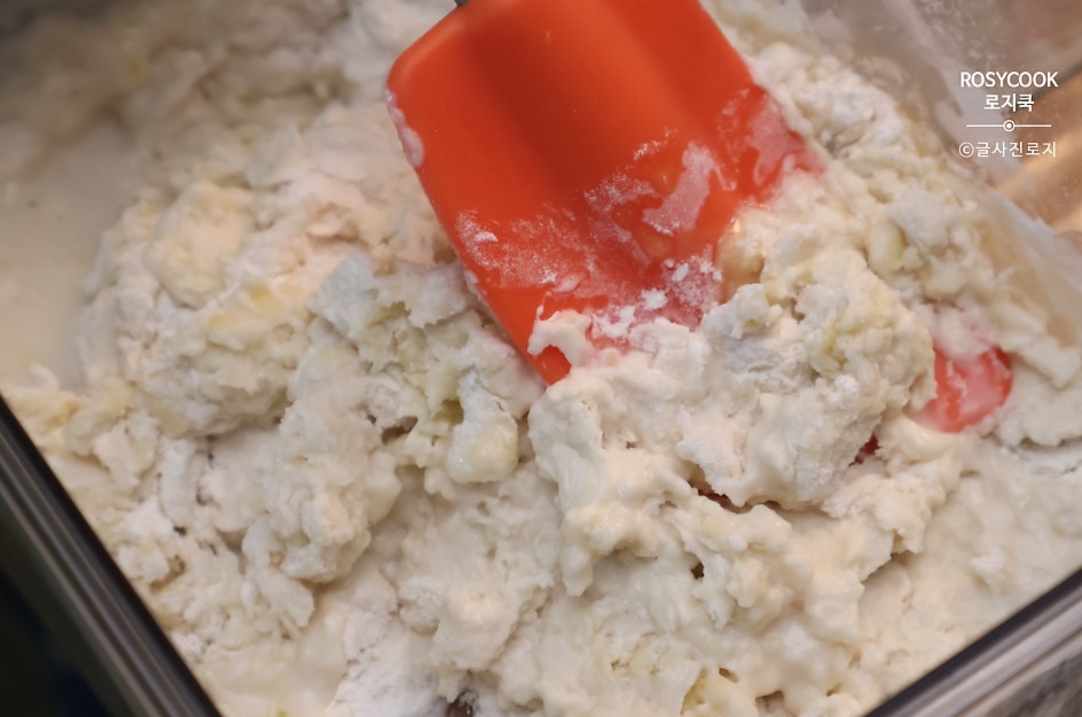 6. 날가루가 없어질 때까지 주걱으로 섞어줍니다.