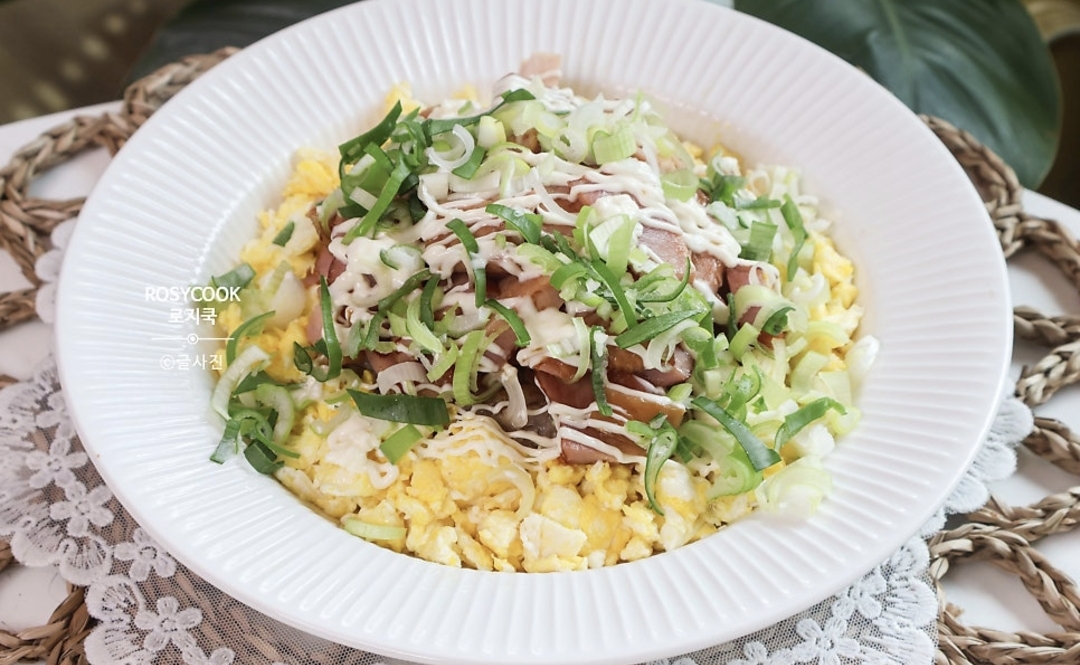 7. 밥을 그릇에 담아주시고, 주변에 계란스크램블을 올려줍니다.