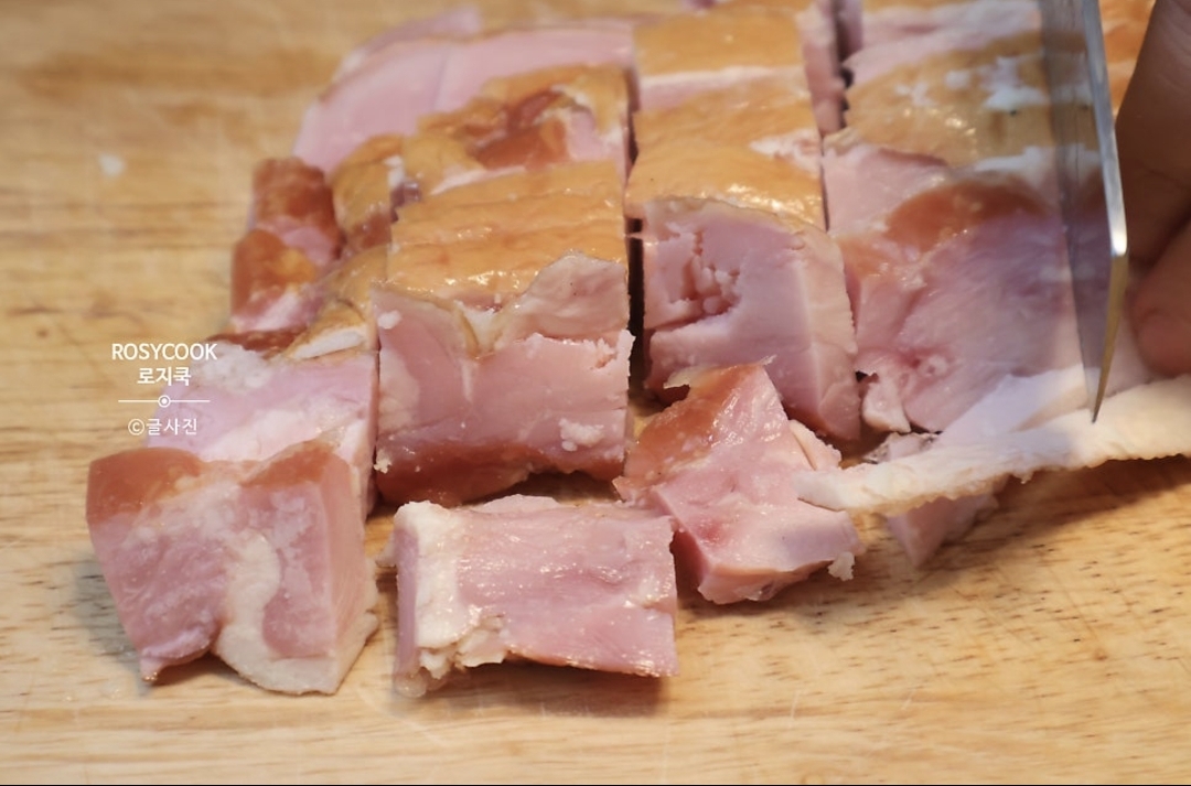 2. 훈제 치킨 300g을 먹기 좋게 썰어줍니다. 남은 치킨을 사용하실 분들은 잘게 찢어서 준비해 주시면 됩니다.