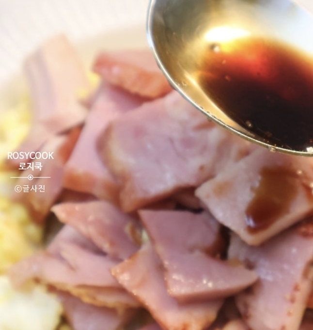 8. 준비해둔 훈제 치킨을 올려주고 취향껏 끓인 치킨마요 소스를 부어줍니다.