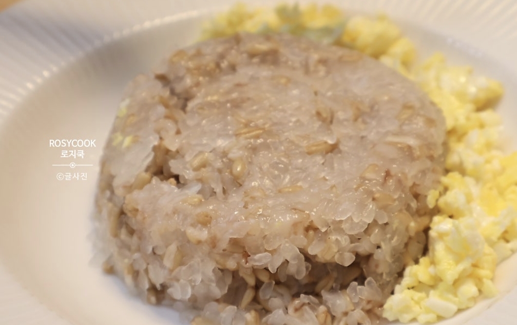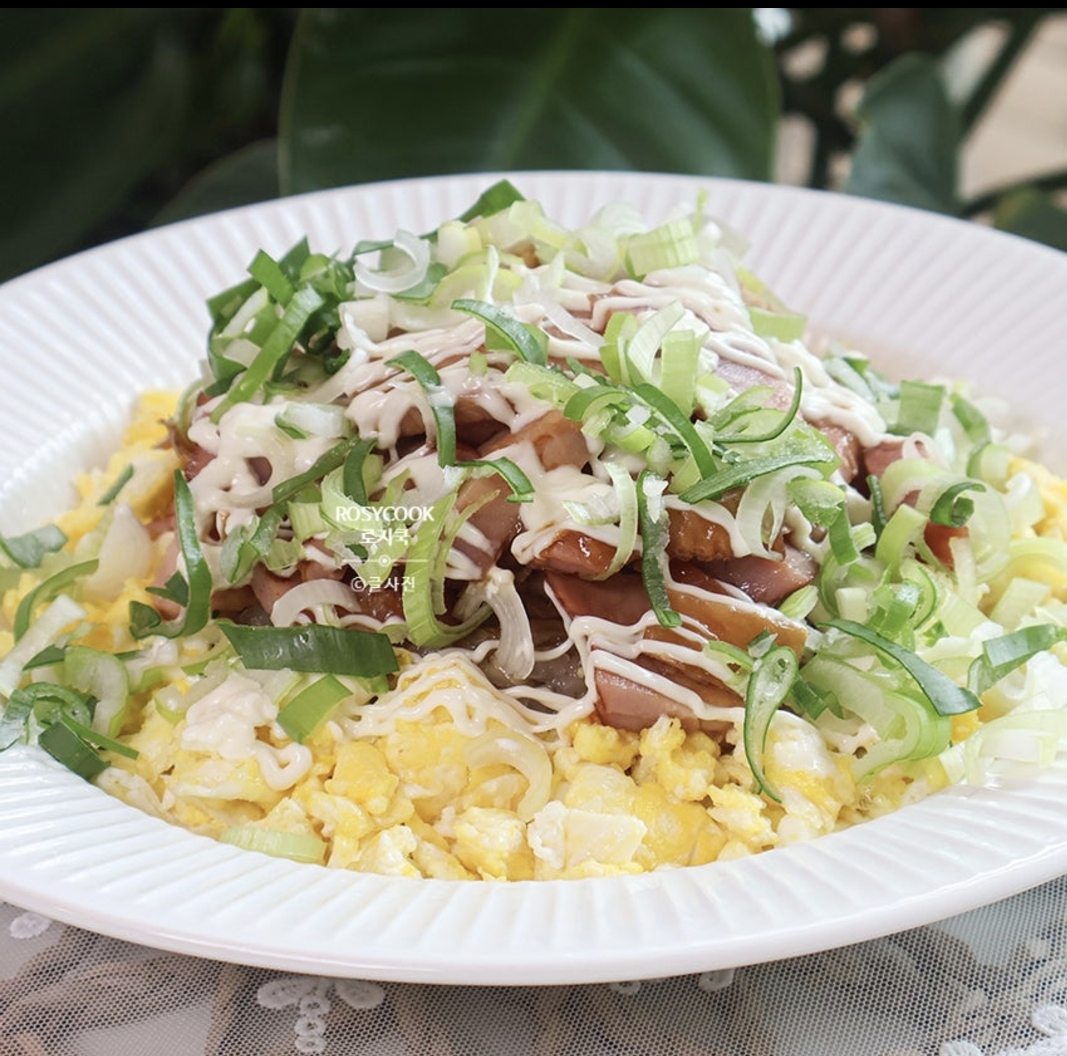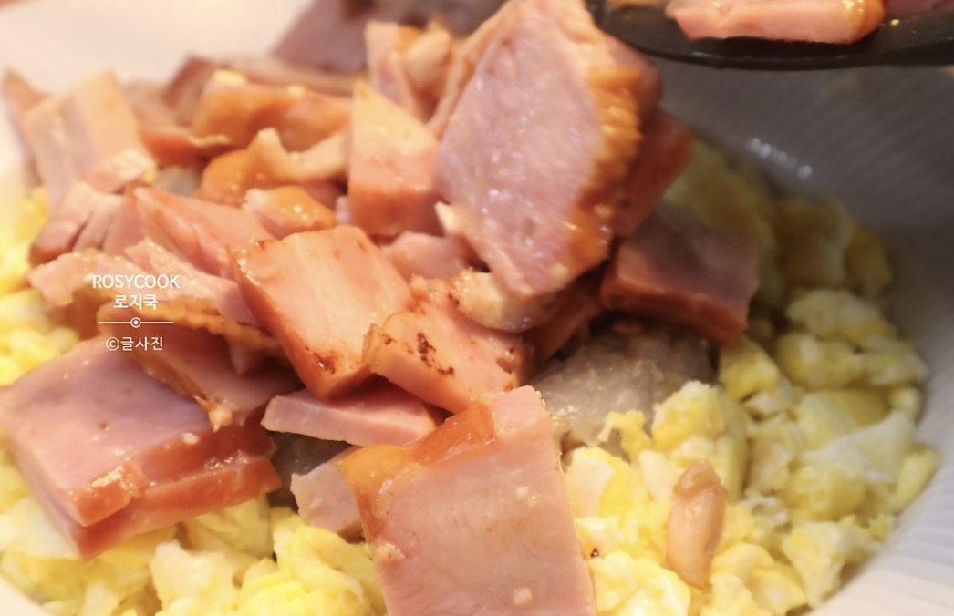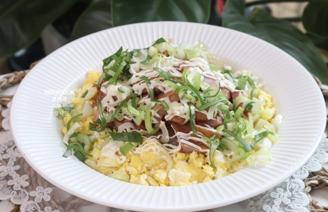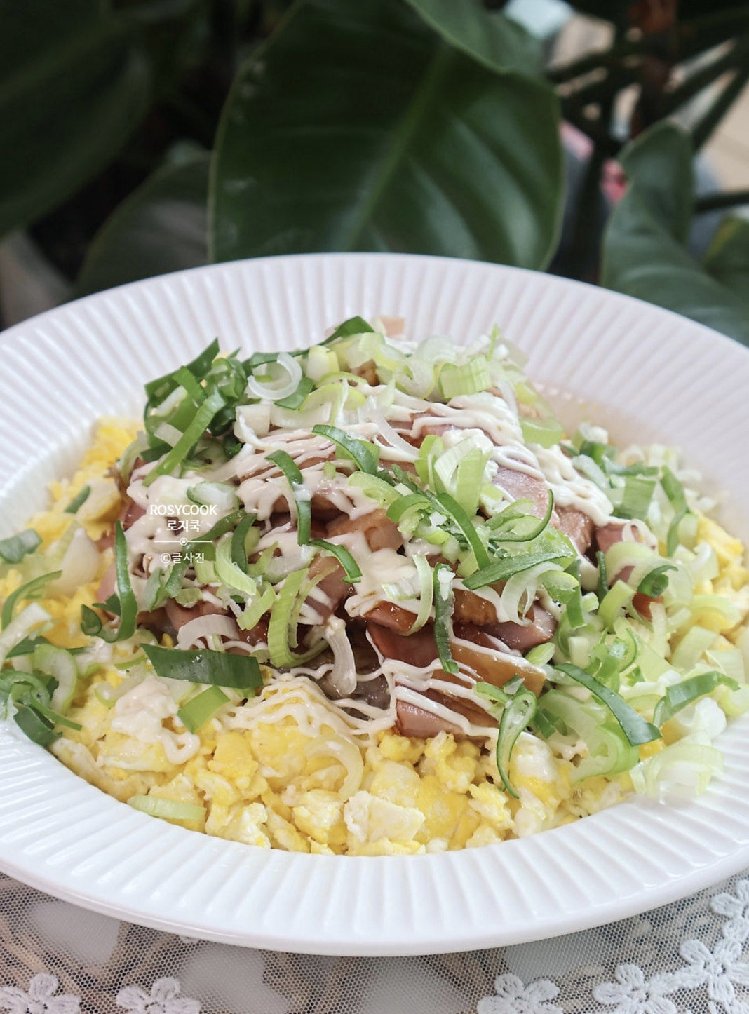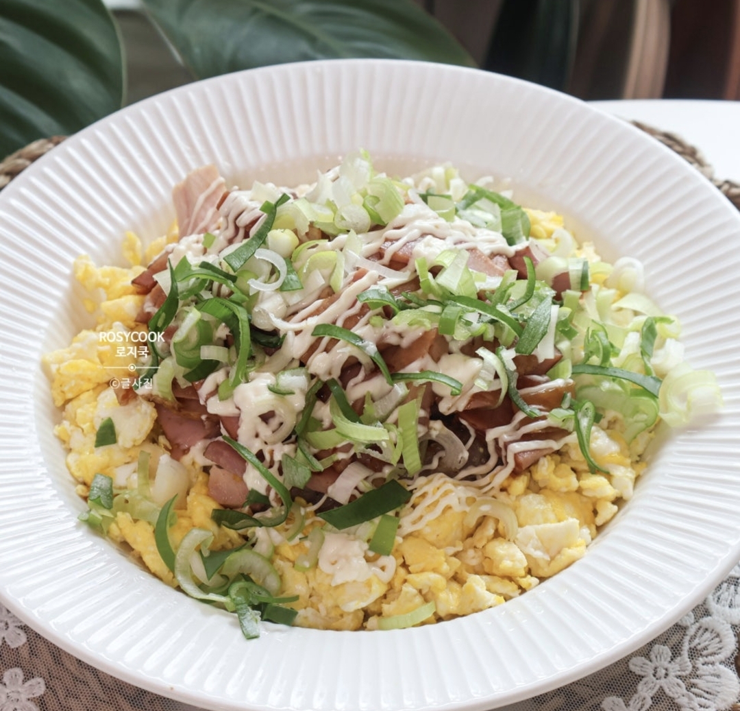 7. 밥을 그릇에 담아주시고, 주변에 계란스크램블을 올려줍니다.
