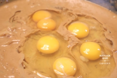 6. 계란 5알을 넣고 계란이 익을 때까지 저어가며 끓여줍니다.