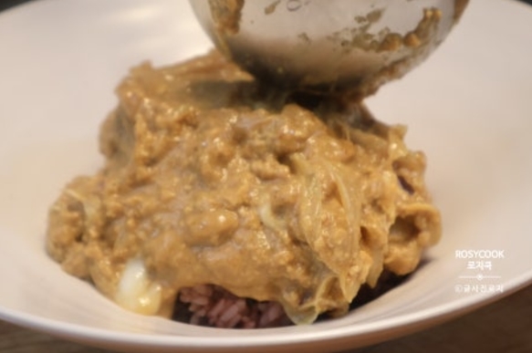 7. 그릇에 밥을 담아준 후, 계란카레 양파카레를 담아줍니다.