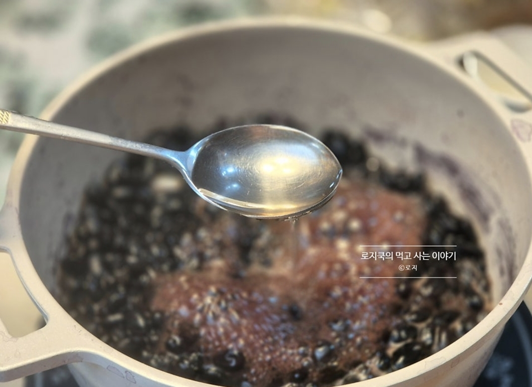 중간중간 저어가며 양념이 밸 때까지 조려주는데, 이때 남은 물에서 30% 정도 수분이 남을 정도로 조려주시면 됩니다.