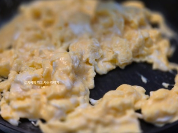 3. 약불에서 저으면서 익혀주시고요. 계란이 어느 정도 익으면 잘개 쪼개가며 익혀줍니다.