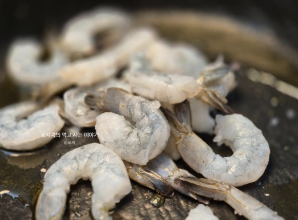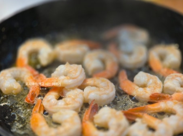 6. 칵테일 새우를 흐르는 물에서 세척한 후, 키친타월로 꾹꾹 눌러 물기를 제거해 줍니다. 새우를 익혀줍니다.