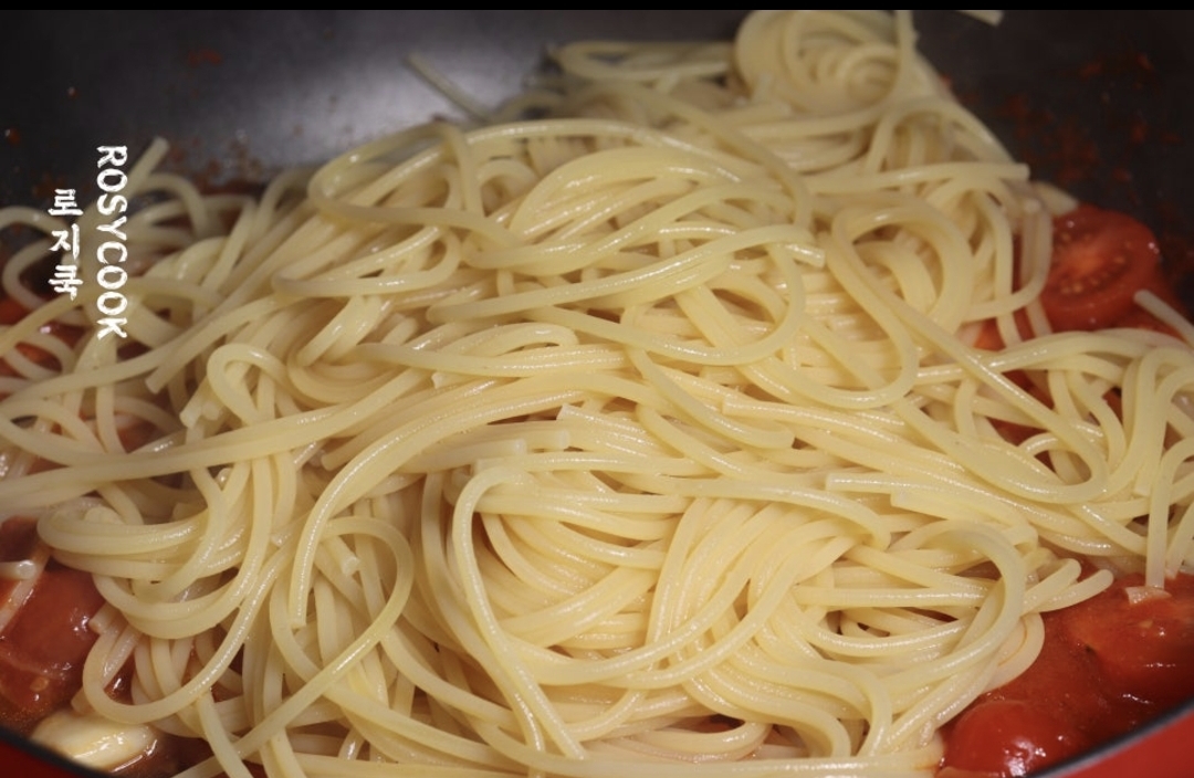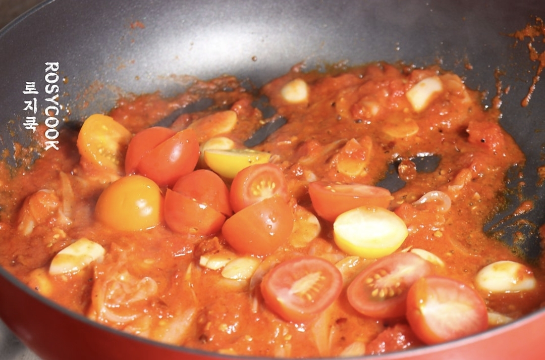 썰어둔 방울토마토를 넣고 함께 볶아줍니다. 일단 아라비아따 파스타 소스는 완성입니다.