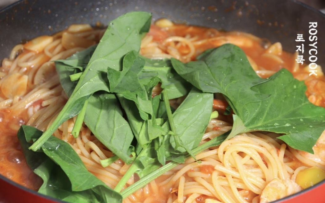 시금치를 넣고 살짝 졸여줍니다. 시금치의 숨이 너무 확 죽지 않을 정도로 조리해 줍니다.