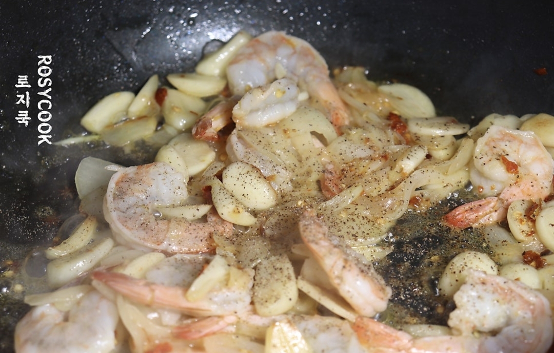 8. 찬물에서 해동해 준 칵테일 새우 8마리를 함께 볶다가 후춧가루를 살짝 뿌려줍니다.