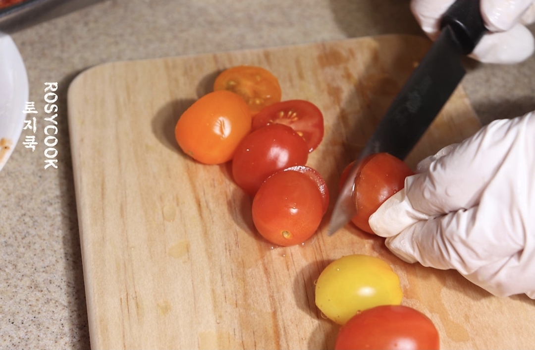 4. 방울토마토 6개를 반으로 썰어서 준비합니다.