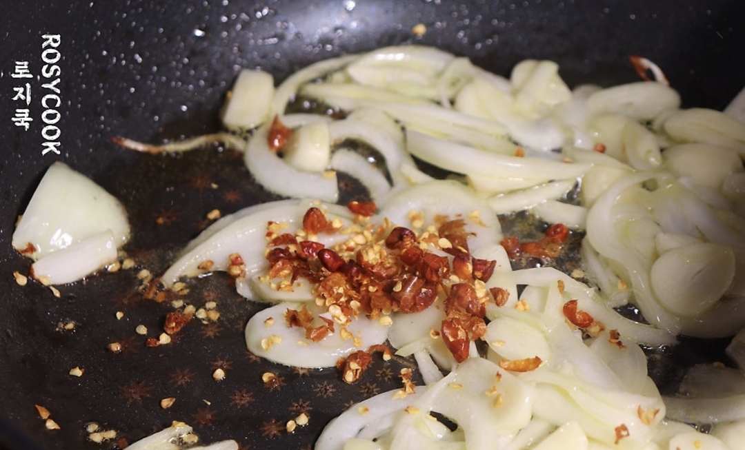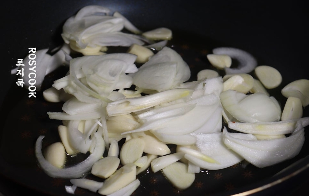 6. 썰어둔 마늘과 양파를 볶아줍니다.