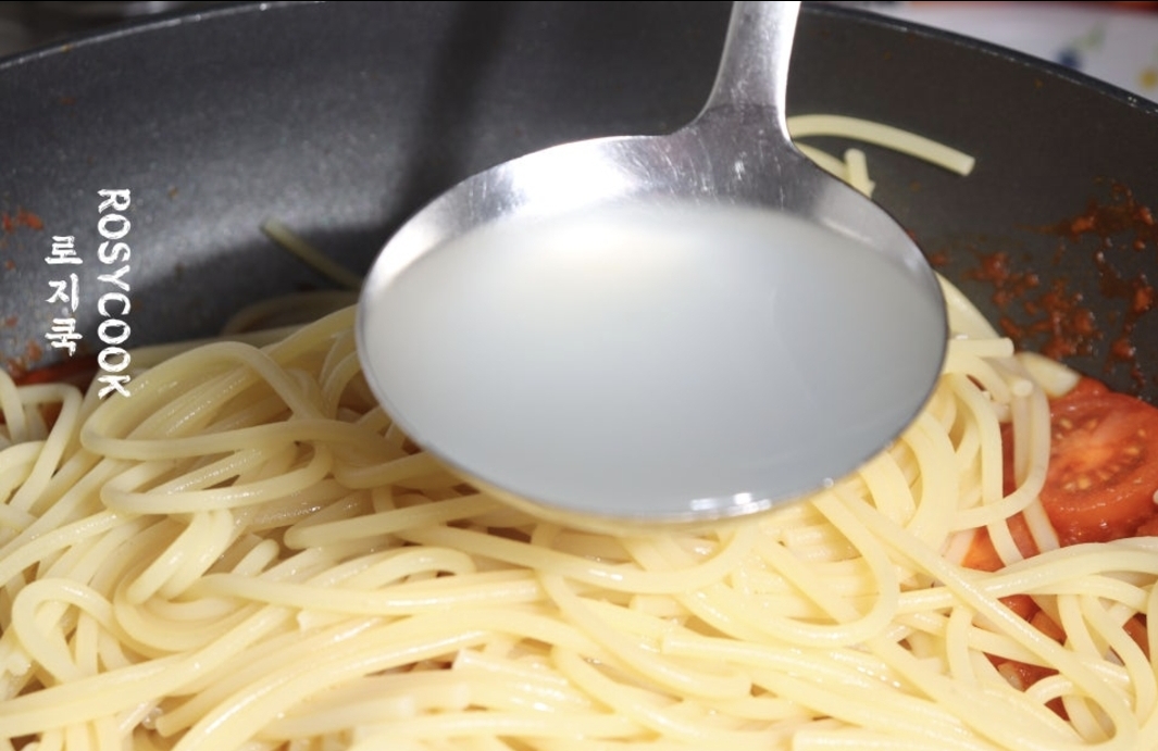 13. 삶은 면을 넣고, 면수를 4국자 정도 붓습니다. 면을 볶으면서, 올리브유 1 큰 술 정도를 추가해 줍니다.