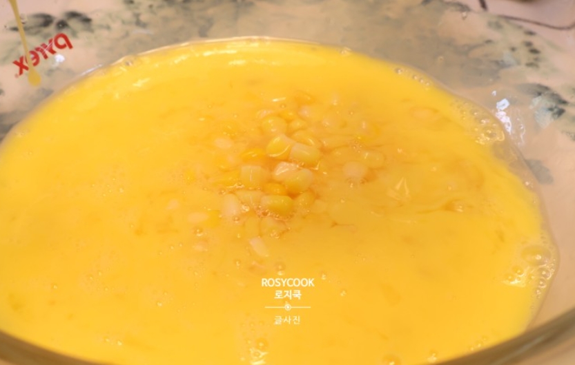 2. 계란을 잘 풀어준 후, 캔옥수수를 넣어줍니다.