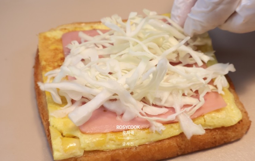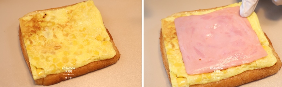 9. 준비해둔 계란과 샌드위치 햄을 올립니다.