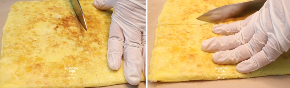 3. 팬에 식용유를 두르고, 옥수수가 뭉치지 않게 잘 펼쳐준 후 부쳐줍니다. 사각팬을 사용하시면 좋습니다. 잘 익으면 한 번 뒤집어서 익혀주세요. 정사각형으로 썰어서 준비해 주시면 됩니다.