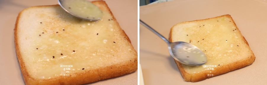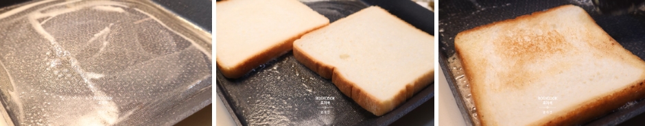 5. 팬에 무염버터를 녹여주고, 식빵을 노릇하게 굽습니다.