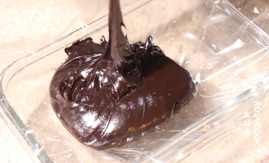6. 만들어둔 초콜릿을 랩 위에 부어주고, 뚜껑을 덮어서 냉장고에서 1 ~ 2 시간 정도 보관해 줍니다.