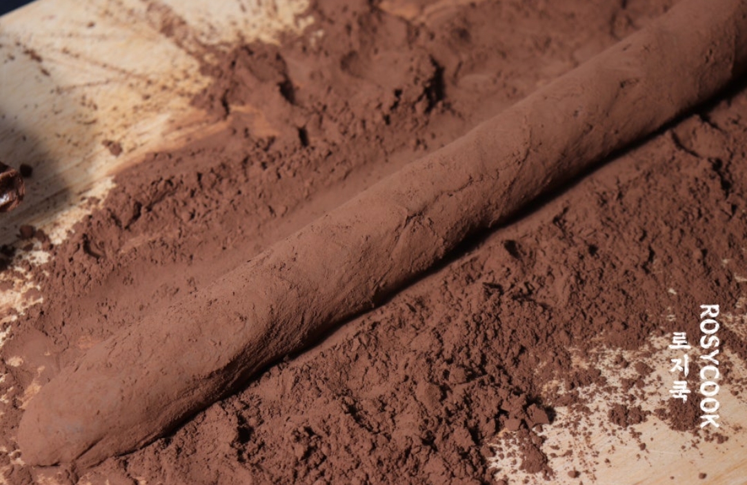 8. 카카오가루를 깔아주고, 랩에서 초콜릿을 꺼내줍니다. 초콜릿을 먹기 좋은 크기로 썰기 위해 더 길게 만들어주시는 게 좋습니다. 랩에서 초콜릿을 꺼내주신 후, 카카오가루를 묻혀주세요. 초콜릿을 먹기 좋은 크기로 썰기 위해 더 길게 만들어줍니다.