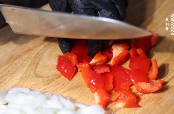 5. 빨간 파프리카와 청피망의 속을 제거한 후, 깍둑썰기 해줍니다. 1/2개씩 사용했습니다.