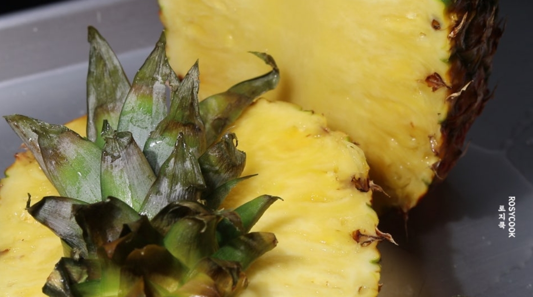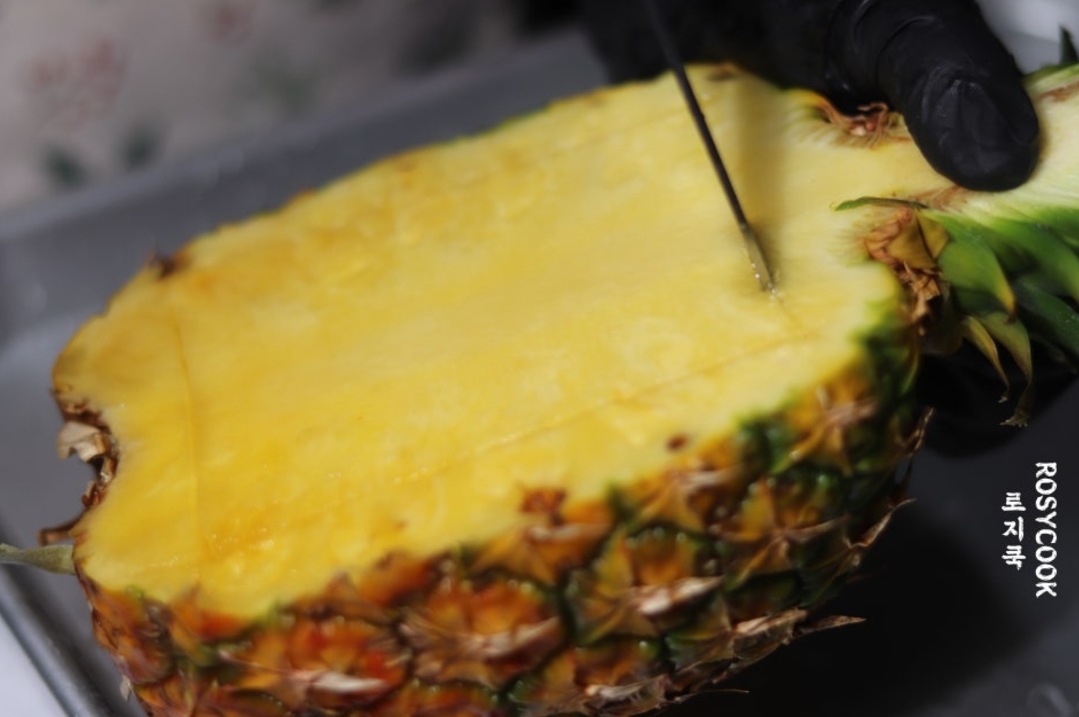 1. 파인애플을 깨끗하게 세척한 후, 세워서 반으로 썰어줍니다.