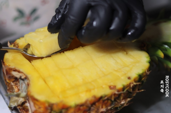 2. 파인애플에 사각형으로 칼집을 내줍니다. 큐브 모양이 나오도록 작은 숟가락으로 떠줍니다. 심지를 제거해 주셔도 되지만, 심지에도 영양이 많기 때문에 볶음밥에 사용했습니다.