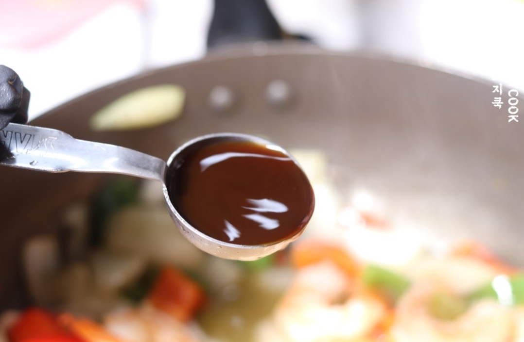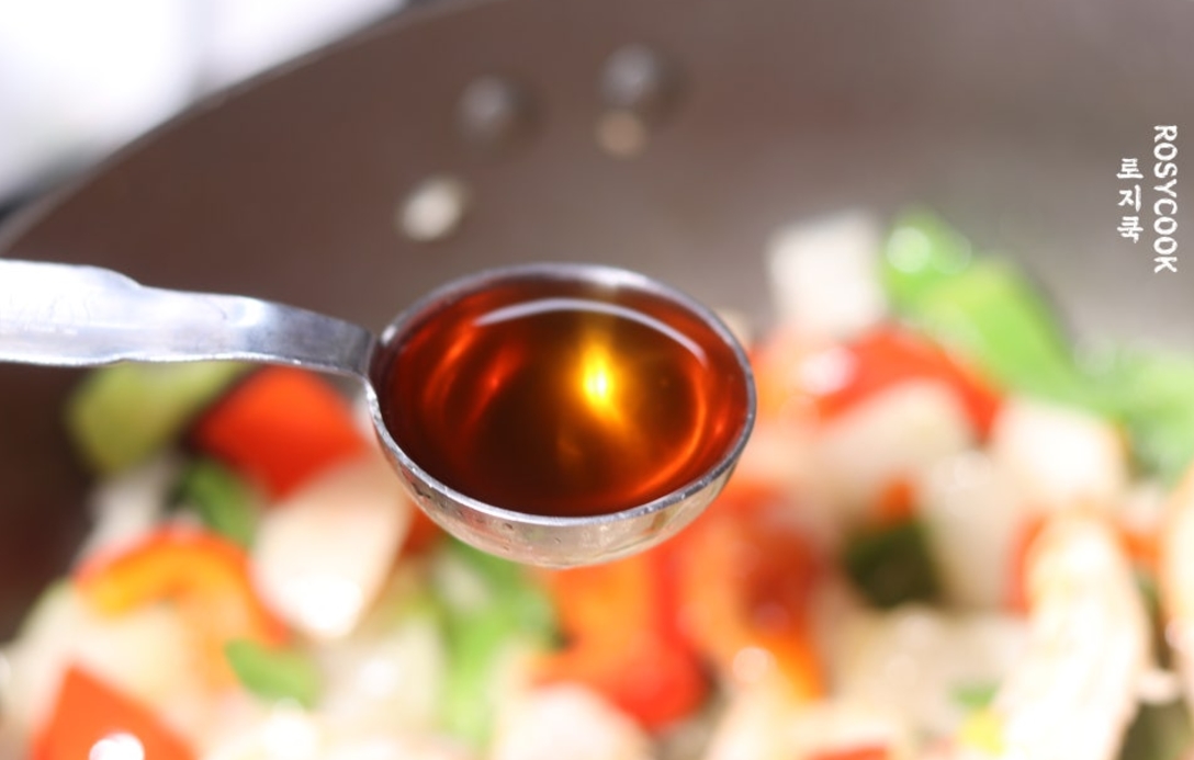 10. 피시소스 대신 멸치액젓을 사용했습니다. 2 큰 술을 넣어줬습니다. 볶는 양에 따라 양 조절을 해줍니다.