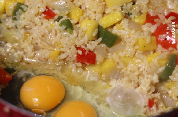 18. 계란이 익었다면 옆으로 밀어둔 밥과 함께 볶아줍니다.