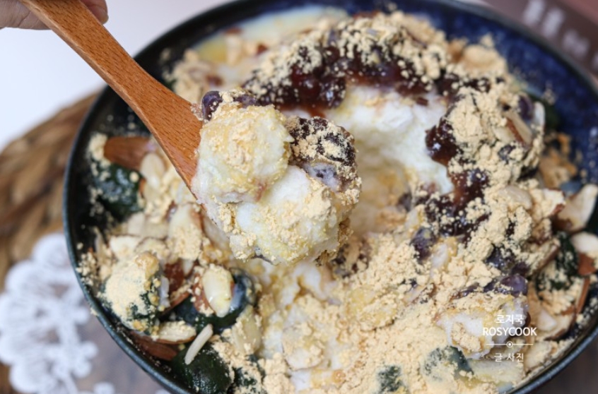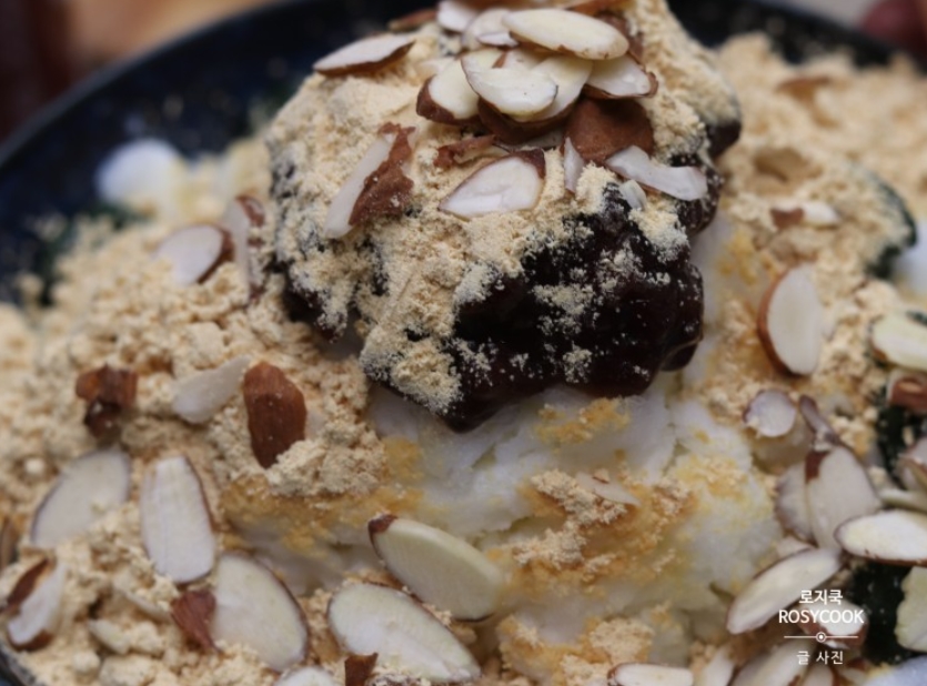 10. 콩가루를 듬뿍 뿌려주시고, 슬라이스 아몬드를 뿌려줍니다.
