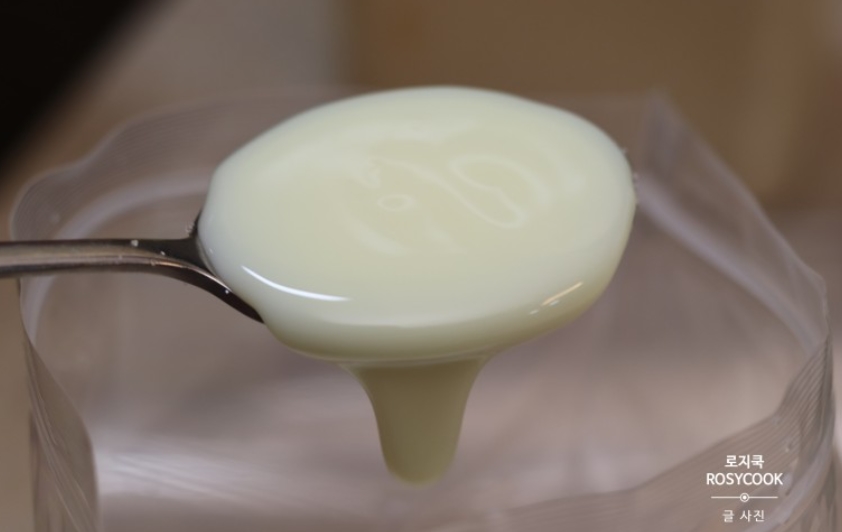 4. 연유를 넣어줍니다. 잘 섞어주세요. 지퍼백을 꽉 닫고 흔들어주셔도 좋습니다. 찬 것일수록 단 맛이 약해지기 때문에 이정도 넣어도 크기 달지는 않습니다. 단 맛은 취향껏 조절해 주세요. 후에 연유와 팥을 추가해서 먹을 것을 감안해 주시고요.