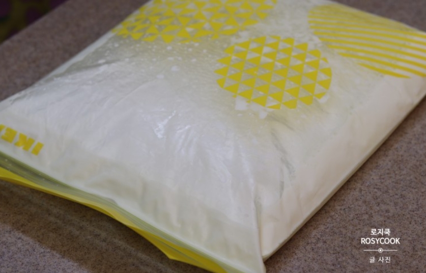 5. 지퍼백을 잘 펼친 상태에서 얼려줍니다. 평평한 곳에 올려서 얼리셔야 나중에 깨지 쉽습니다.