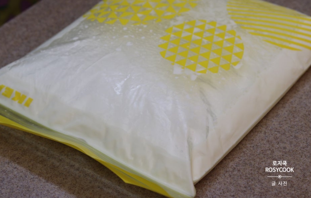 지퍼백에 우유 4컵과 물 1컵을 넣고 설탕과 연유도 각각 3큰술씩 넣어줍니다. 지퍼백을 잘 닫고 흔들어서 내용물을 골고루 섞어주세요.