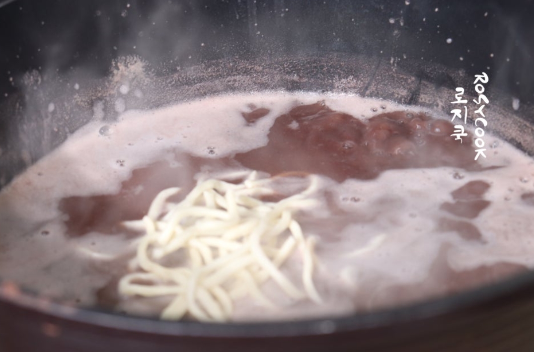 13. 칼국수면 3인분을 넣어줍니다. 원래는 칼국수를 끓일 때 깔끔하게 끓이기 위해 찬물에 전분을 헹궈서 사용하지만, 팥칼국수는 걸쭉해야 맛있기에 헹구지 않고 그냥 넣었습니다. 저는 생칼국수 면을 사용했습니다.